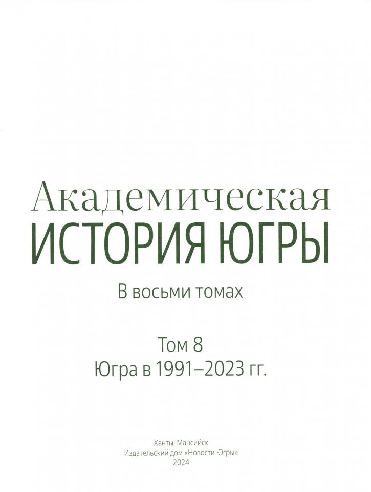 Академическая история Югры : в восьми томах / С. И. Веселов, Е. В. Воронина, Е. М. Главацкая [и др.] ; главная редакционная коллегия: Р. Г. Пихоя (главный редактор) [и др.] ; редакционная коллегия тома: С. В. Журавлев (ответственные редакторы) [и др.] ; Институт истории и археологии УрО РАН [и др.]. - Ханты-Мансийск : Новости Югры, 2024. - Т. 8 : Югра в 1991-2023 гг. - 784 с.