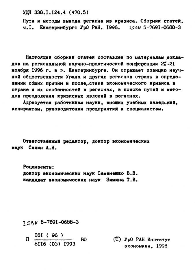 Анисимова М. А. Антимонопольная политика в экономике региона / М. А. Анисимова, А. Г. Мокроносов, Н. В. Пахнев // Пути и методы вывода региона из кризиса : материалы докладов региональной научно-практической конференции, 20-21 ноября 1996 г., г. Екатеринбург : сборник статей. - Екатеринбург, 1996. - Ч. 1. - С. 44-46.