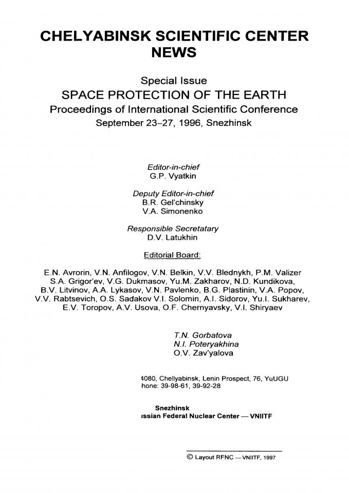 Chelyabinsk Scientific Center. Chelyabinsk Scientific Center News / Chelyabinsk Scientific Center, RAS Ural Branch [et al.] ; editor-in-chief G. P. Vyatkin ; 1997. - Special issue, pt. 2 : Space Protection of the Earth. - 155 р.