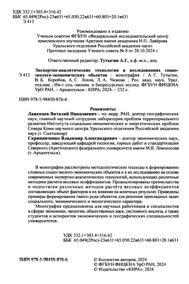 Экспертно-аналитические технологии в исследованиях социо-эколого-экономических объектов / А. Г. Тутыгин, В. Б. Коробов, А. С. Лохов, Л. А. Чижова ; ответственный редактор А. Г. Тутыгин ; Российская академия наук, Уральское отделение, Федеральный исследовательский центр комплексного изучения Арктики имени академика Н. П. Лаверова, Институт социально-экономических и биоресурсных исследований. - Архангельск : КИРА, 2024. - 231 с.