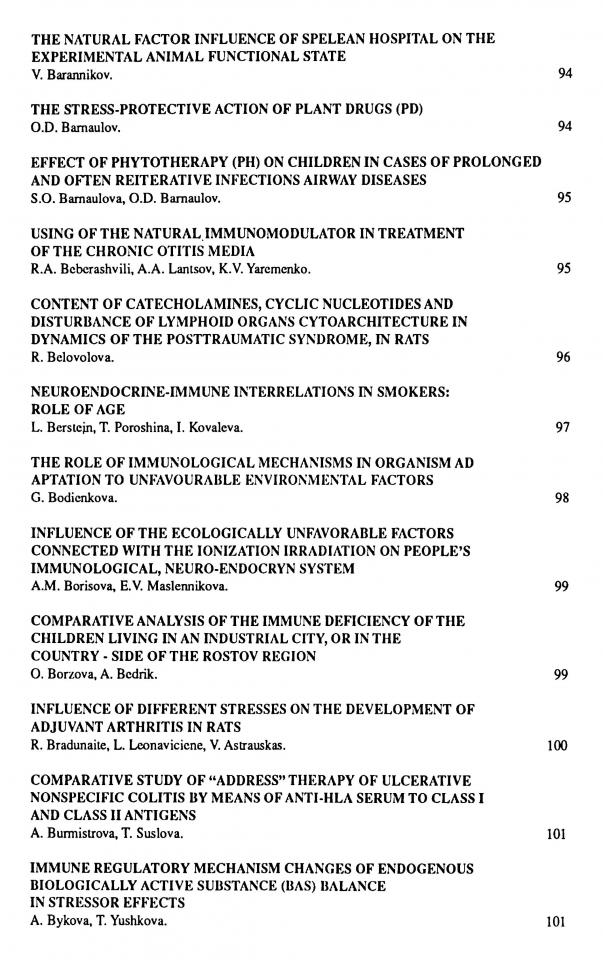 Endocrine-immune interlinks in women with menstrual cycle disorders / E. Sandakova, B. Bachmetyev, Ju. Shilov [et al.] // The 1995 International Co-Conference on Environmental Polution (ICEP’ 95) and Neuroimmuno Interactions and Environment (ICONE’ 95), 17-24 July, 1995, Saint Petersburg, Russia. - Saint Petersburg, Russia, 1995. - P. 166.
