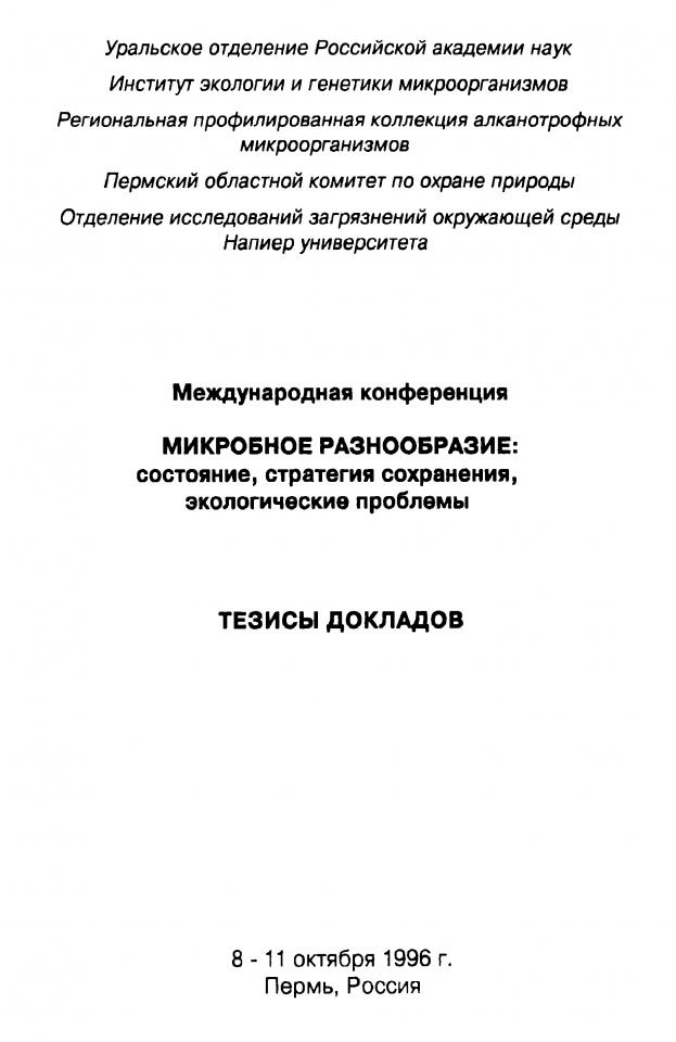 Энергетическое состояние Escherichia coli и обмен путресцина и калия между клеткой и средой как факторы адаптации к гиперосмотическому шоку / А. Г. Ткаченко, О. Я. Салахетдинова, М. Р. Пшеничнов, Л. Ю. Нестерова // Микробное разнообразие: состояние, стратегия сохранения, экологические проблемы : Международная конференция, 8-11 октября 1996 г., Пермь, Россия : тезисы докладов = "COMID'96": Microbial Diversity: current situation, conversation strategy and ecological aspects : International Conference, 8-11 October 1996, Perm, Russia : abstracts. - Пермь, 1996. - С. 106-107.
