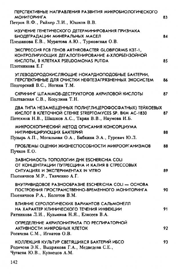 Энергетическое состояние Escherichia coli и обмен путресцина и калия между клеткой и средой как факторы адаптации к гиперосмотическому шоку / А. Г. Ткаченко, О. Я. Салахетдинова, М. Р. Пшеничнов, Л. Ю. Нестерова // Микробное разнообразие: состояние, стратегия сохранения, экологические проблемы : Международная конференция, 8-11 октября 1996 г., Пермь, Россия : тезисы докладов = "COMID'96": Microbial Diversity: current situation, conversation strategy and ecological aspects : International Conference, 8-11 October 1996, Perm, Russia : abstracts. - Пермь, 1996. - С. 106-107.