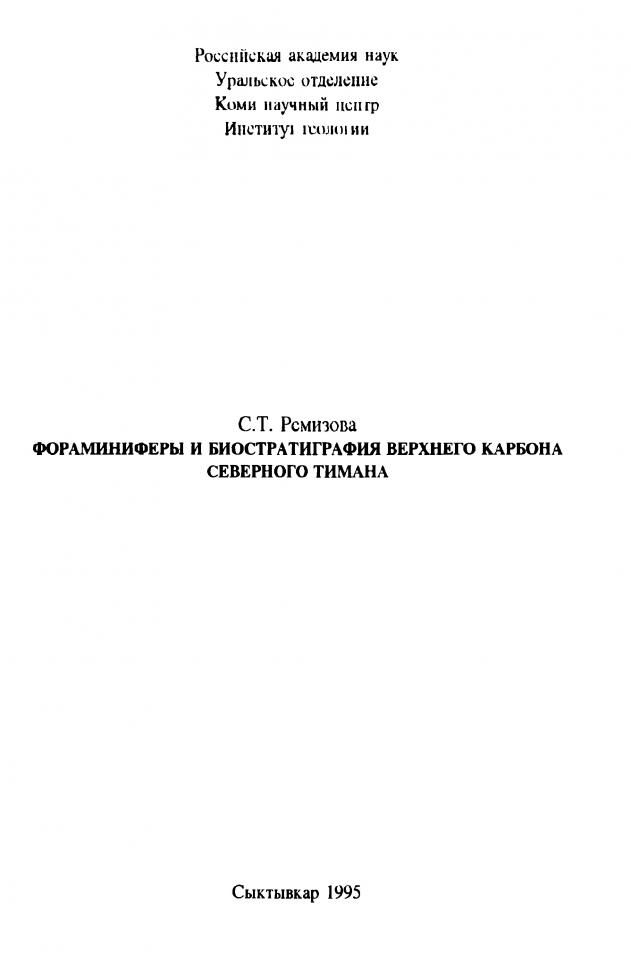 Ремизова С. Т. Фораминиферы и биостратиграфия верхнего карбона Северного Тимана / С. Т. Ремизова ; ответственный редактор В. А. Чермных ; Российская академия наук, Уральское отделение, Коми научный центр, Институт геологии. - Сыктывкар, 1995. - 159 с.
