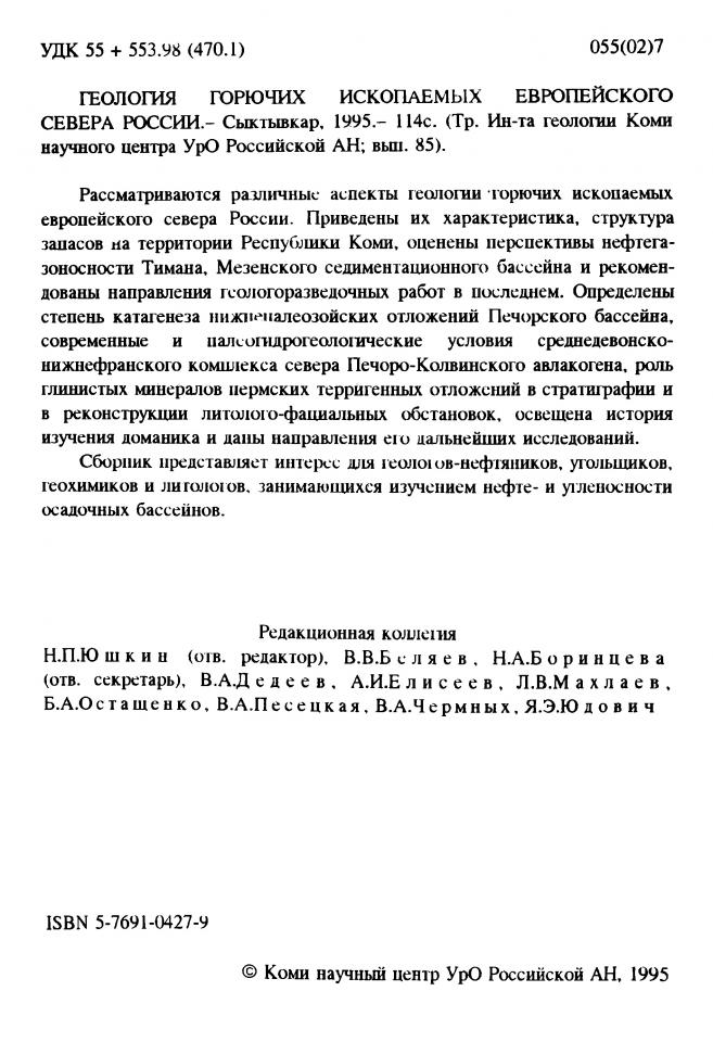 Геология горючих ископаемых европейского севера России / Российская академия наук, Уральское отделение, Коми научный центр ; ответственные редакторы: В. А. Дедеев [и др.]. - Сыктывкар, 1995. - 114 с. - (Труды Института геологии Коми научного центра УрО РАН ; вып. 85).