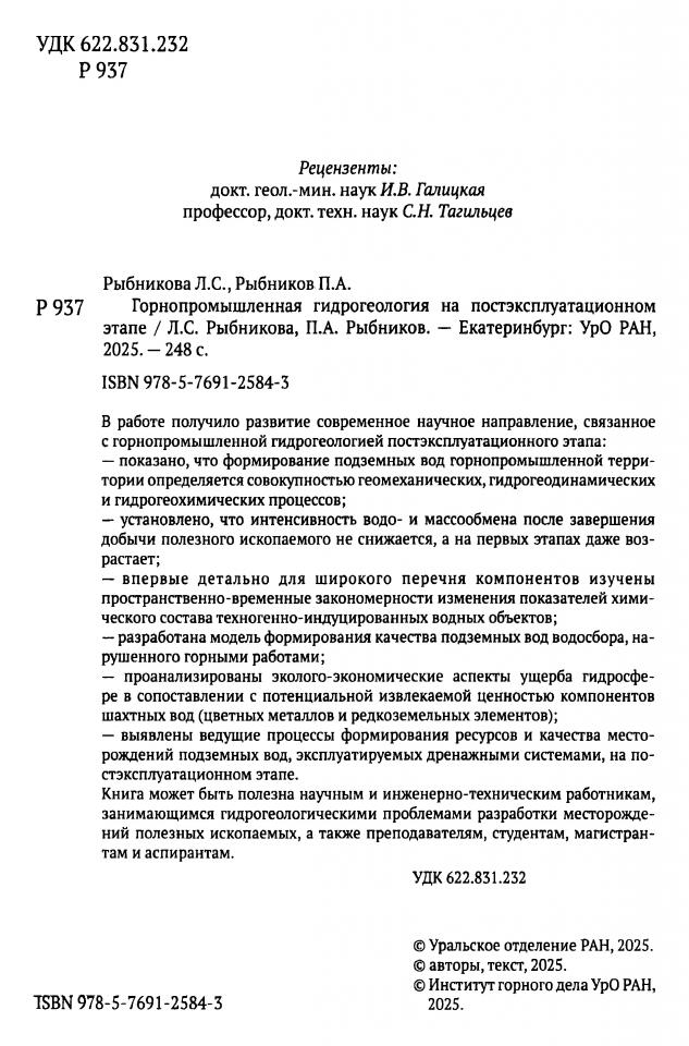 Книга может быть полезна научным и инженерно-техническим работникам, занимающимся гидрогеологическими проблемами разработки месторождений полезных ископаемых, а также преподавателям, студентам, магистрантам и аспирантам.
