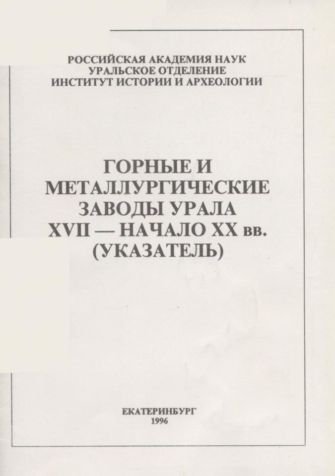 Горные и металлургические заводы Урала, XVII - начало ХХ вв. (указатель) / Уральское отделение, Институт истории и археологии ; главный редактор В. В. Алексеев ; редакционная коллегия: В. Г. Железкин [и др.] ; составитель Е. Ю. Рукосуев. - Екатеринбург, 1996. - 54 с.