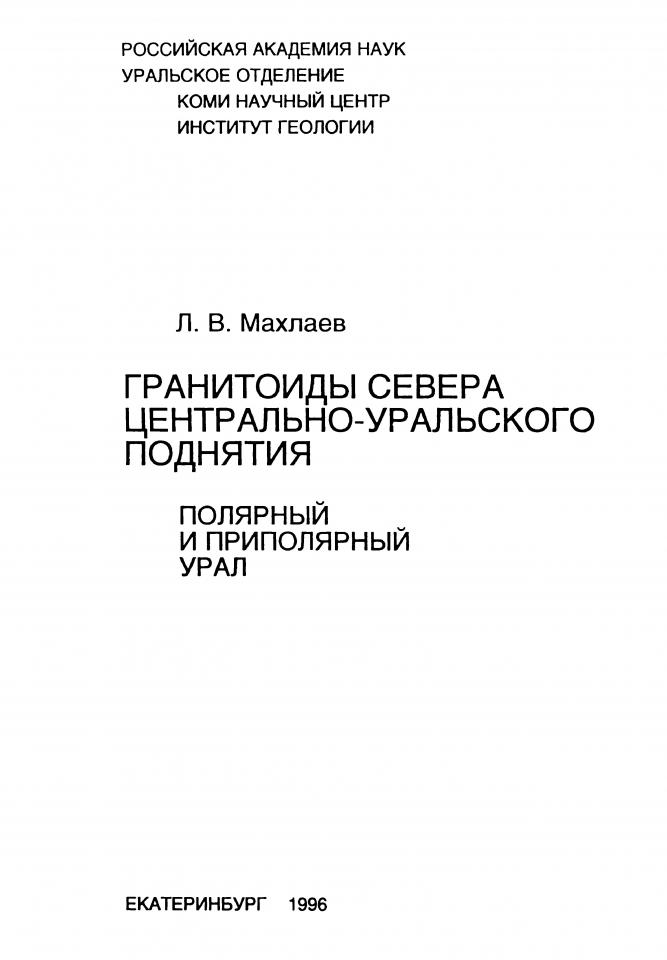 Махлаев Л. В. Гранитоиды севера Центрально-Уральского поднятия (Полярный и Приполярный Урал) / Л. В. Махлаев ; ответственный редактор В. В. Ляхович ; Российская академия наук, Уральское отделение, Коми научный центр, Институт геологии. - Екатеринбург, 1996. - 150 с.