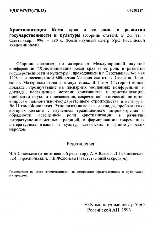Христианизация Коми края и ее роль в развитии государственности и культуры / Российская академия наук, Уральское отделение, Коми научный центр, Институт языка, литературы и истории [и др.] ; редколлегия: Э. А. Савельева (ответственный редактор) [и др.]. - Сыктывкар, 1996. - Т. II : Филология. Этнология. - 1996. - 378 с.