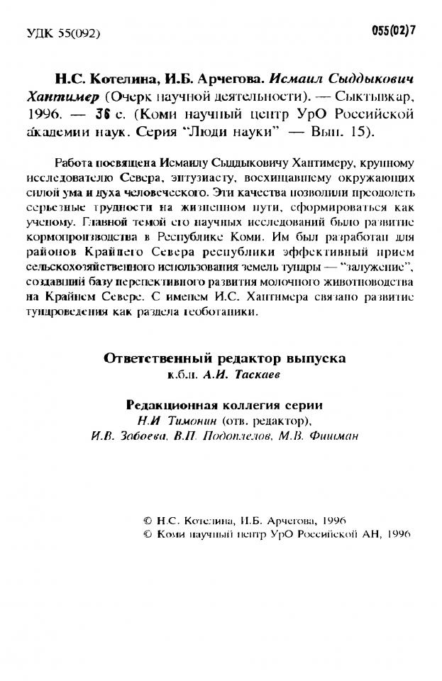 Котелина Н. С. Исмаил Саддыкович Хантимер : (Очерк научной деятельности) / Н. С. Котелина, И. Б. Арчегова ; ответственный редактор выпуска А. И. Таскаев, редакционная коллегия серии: Н. И. Тимонин (отв. редактор) [и др.] ; Российская академия наук, Уральское отделение, Коми научный центр. - Сыктывкар, 1996. - 35 с. - (Люди науки ; вып. 15).