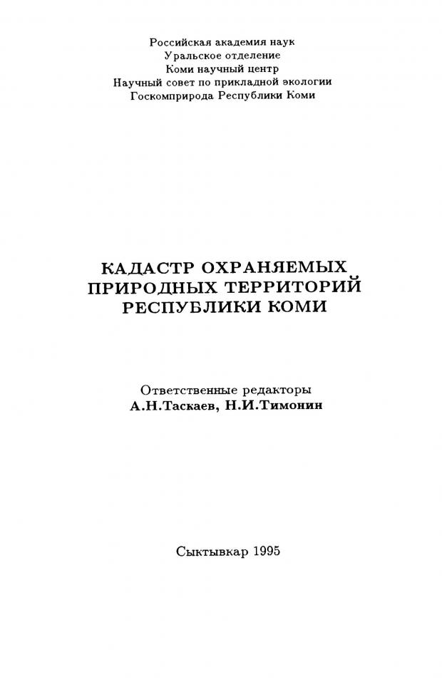 Алексеева Р. Н. Кадастр охраняемых природных территорий республики Коми / Российская академия наук, Уральское отделение, Коми научный центр [и др.] ; Р. Н. Алексеева, В. П. Гладков, С. В. Дегтева ; ответственные редакторы А. И. Таскаев, Н. И. Тимонин. - Сыктывкар, 1995. - Ч. 2. - 60 с.