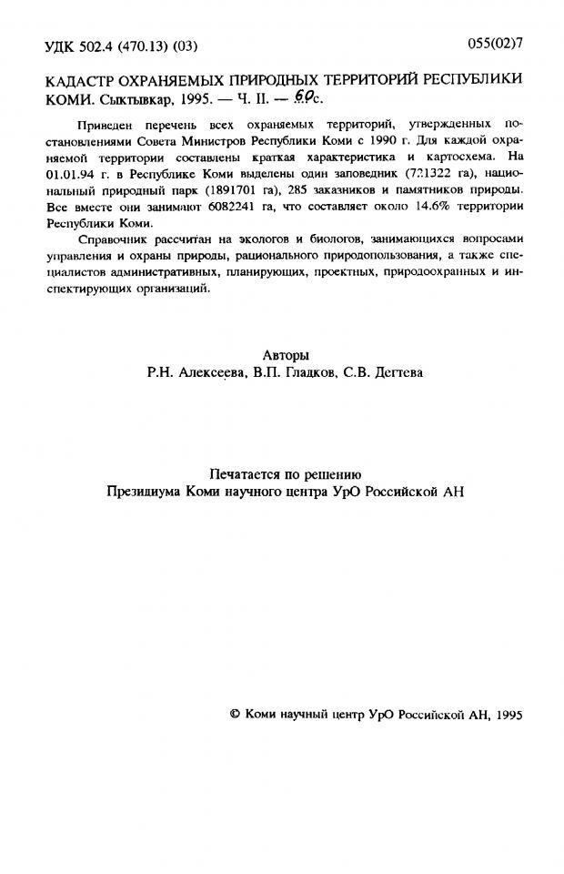 Алексеева Р. Н. Кадастр охраняемых природных территорий республики Коми / Российская академия наук, Уральское отделение, Коми научный центр [и др.] ; Р. Н. Алексеева, В. П. Гладков, С. В. Дегтева ; ответственные редакторы А. И. Таскаев, Н. И. Тимонин. - Сыктывкар, 1995. - Ч. 2. - 60 с.