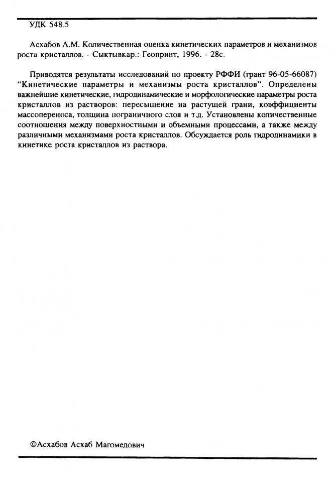 Асхабов А. М. Количественная оценка кинетических параметров и механизмов роста кристаллов / А. М. Асхабов ; Российская академия наук, Уральское отделение, Коми научный центр, Институт геологии [и др.]. - Сыктывкар : Геопринт, 1996. - 28 с.