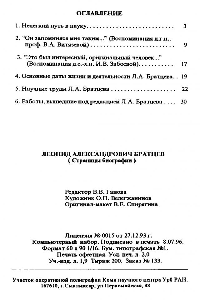 Леонид Александрович Братцев (страницы биографии) / В. П. Подоплелов, Г. А. Естафьев, Н. Н. Ветошкина [и др.] ; ответственный редактор В. П. Подоплелов ; Российская академия наук, Уральское отделение, Коми научный центр. - Сыктывкар, 1996. - 32 с. - (Люди науки ; вып. 16).