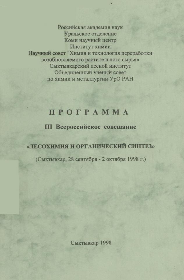 Лесохимия и органический синтез : программа : III Всероссийское совещание (Сыктывкар, 28 сентября - 2 октября 1998 г.) / Российская академия наук, Уральское отделение, Коми научный центр, Институт химии [и др.]. - Сыктывкар, 1998. - 52 с.