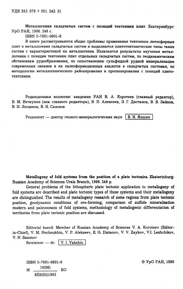 Металлогения складчатых систем с позиций тектоники плит / Российская академия наук, Уральское отделение, Институт геологии и геохимии ; редакционная коллегия: В. А. Коротеев (главный редактор) [и др.]. - Екатеринбург, 1996. - 249 с.