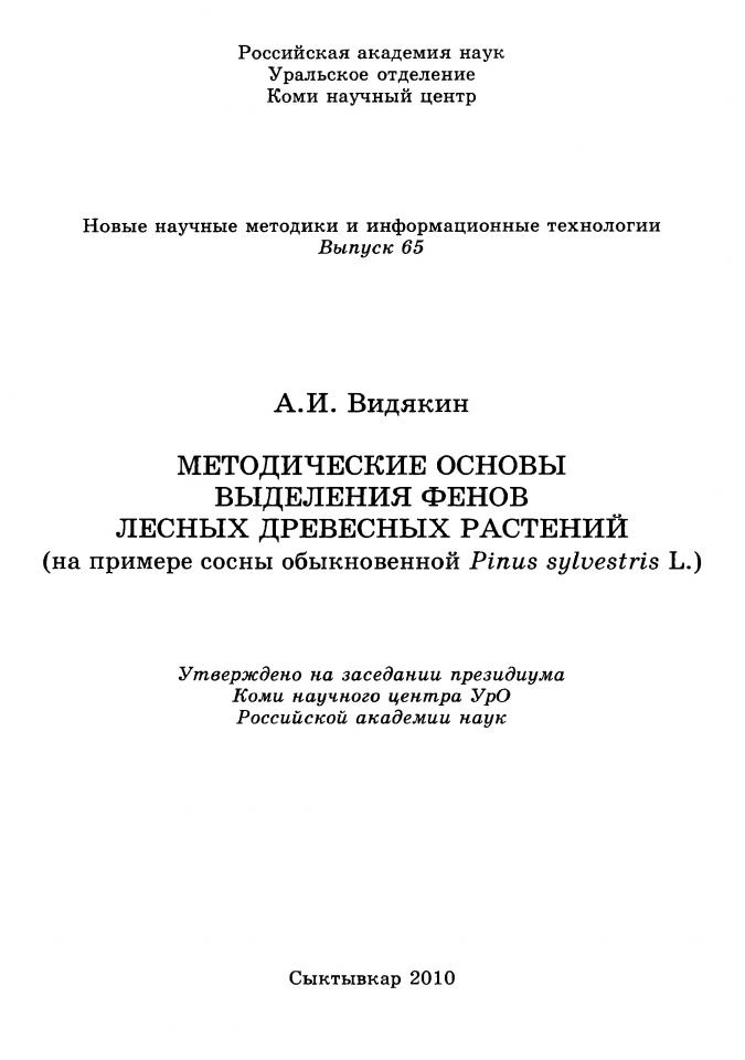 Видякин А. И. Методические основы выделения фенов лесных древесных растений (на примере сосны обыкновенной Pinus sylvestris L.) / А. И. Видякин ; ответственный редактор Ю. С. Оводов [и др.] ; Российская академия наук, Уральское отделение, Коми научный центр. - Сыктывкар, 2010. - 28 с. - (Новые научные методики и информационные технологии ; вып. 65).