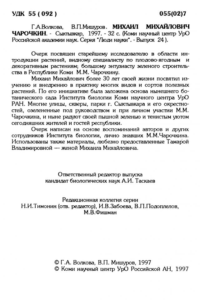 Волкова Г. А. Михаил Михайлович Чарочкин : (страницы биографии известного дендролога Республики Коми) / Российская академия наук, Уральское отделение, Коми научный центр ; Г. А. Волкова, В. П. Мишуров ; редакционная коллегия серии: А. И. Тимонин (отв. редактор) [и др.]. - Сыктывкар, 1997. - 31 с. - (Люди науки ; вып. 24).