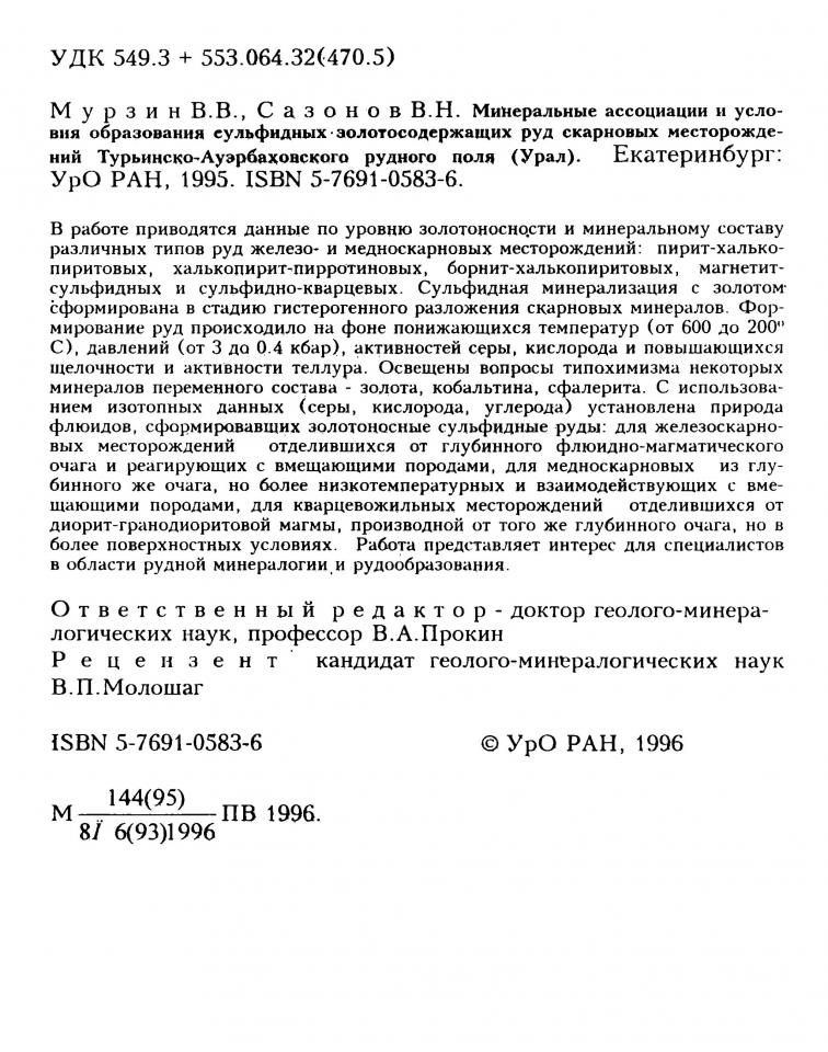 В работе приводятся данные по уровню золотоносности и минеральному составу различных типов руд железо- и медноскарновых месторождений: пирит-халько-пиритовых, халькопирит-пирротиновых, борнит-халькопиритовых, магнетит-сульфидных и сульфидно-кварцевых. Сульфидная минерализация с золотом-сформирована в стадию гистерогенного разложения скарновых минералов. Формирование руд происходило на фоне понижающихся температур (от 600 до 200 °С), давлений (от 3 до 0.4 кбар), активностей серы, кислорода и повышающихся щелочности и активности теллура. Освещены вопросы типохимизма некоторых минералов переменного состава - золота, кобальтина, сфалерита. С использованием изотопных данных (серы, кислорода, углерода) установлена природа флюидов, сформировавших золотоносные сульфидные руды: для железоскарновых месторождений отделившихся от глубинного флюидно-магматического очага и реагирующих с вмещающими породами, для медноскарновых из глубинного же очага, но более низкотемпературных и взаимодействующих с вмещающими породами, для кварцевожильных месторождений отделившихся от диорит-гранодиоритовой магмы, производной от того же глубинного очага, но в более поверхностных условиях. Работа представляет интерес для специалистов в области рудной минералогии и рудообразования.