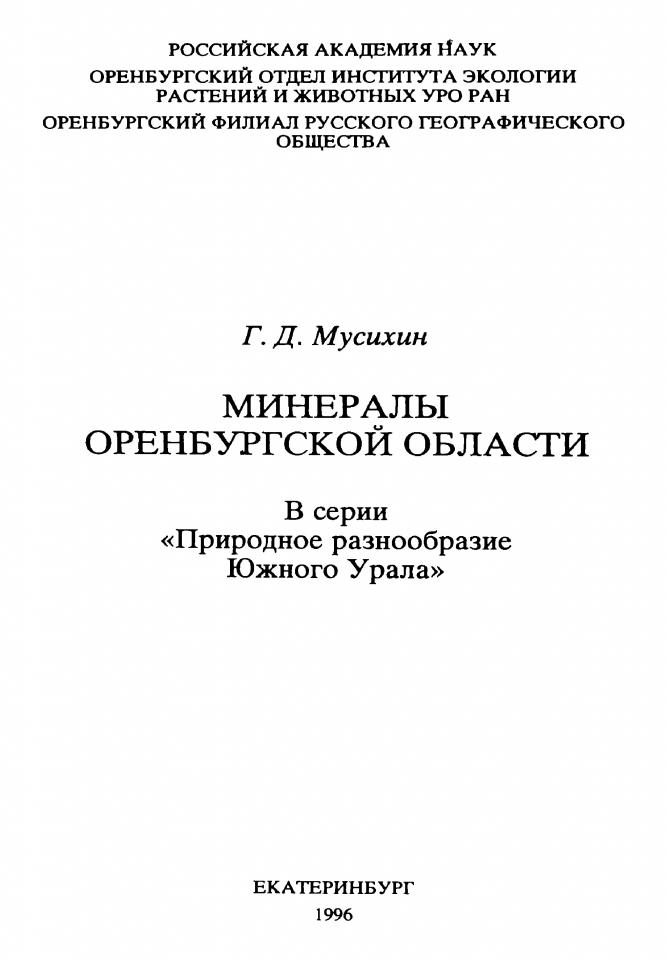 Мусихин Г. Д. Минералы Оренбургской области / Г. Д. Мусихин ; ответственный редактор А. А. Чибилев ; Российская академия наук, Оренбургский отдел Института экологии растений и животных УрО РАН [и др.]. - Екатеринбург, 1996. - 95, [1] с. - (Природное разнообразие Южного Урала).