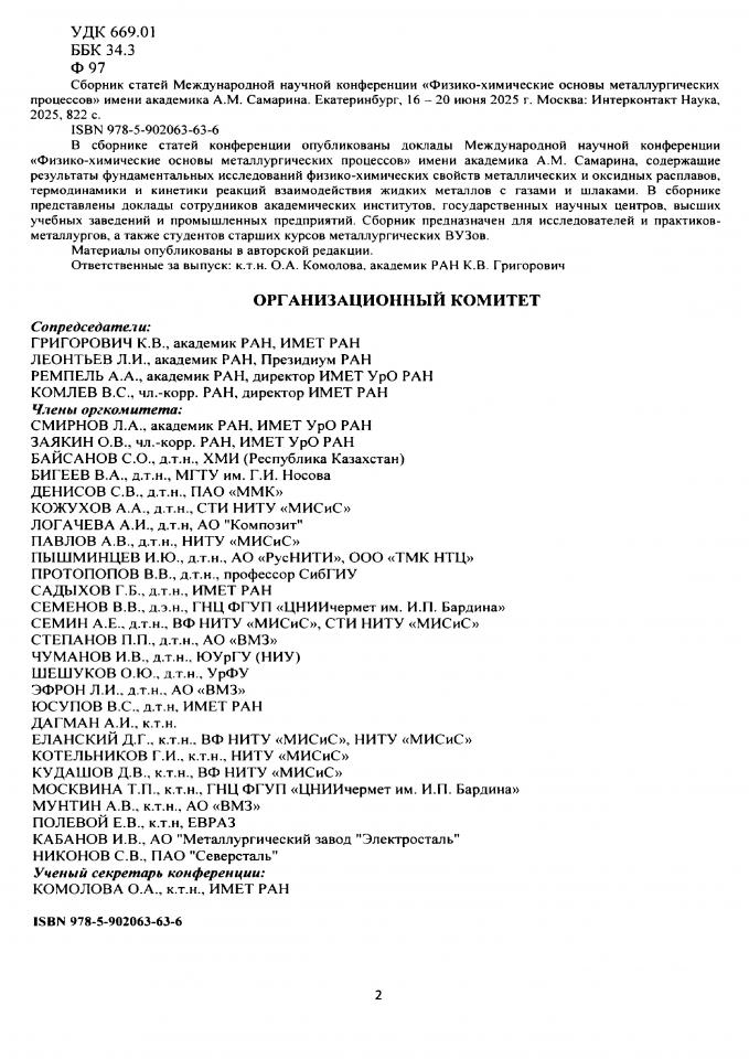 Крашанинин В. А. Моделирование кристаллизации железоуглеродистых расплавов с легирующими добавками Al, V, Ti с учетом химических реакций / В. А. Крашанинин // Физико-химические основы металлургических процессов : сборник статей Международной научной конференции имени академика А. М. Самарина, ФХОМП 2025, 16-20 июня 2025 г. , посвящается 70-летию ИМЕТ УрО РАН. - Екатеринбург : Интерконтакт Наука, 2025. - Т. 2. - С. 727-734.