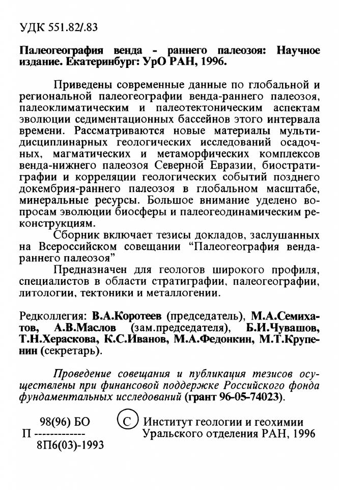 Червяковский С. Г. О характере и соотношении терригенного и вулканогенного осадконакопления в рифтогенных комплексах Приполярного Урала / С. Г. Червяковский // Палеогеография венда-раннего палеозоя (ПВРП - 96) : тезисы докладов Всероссийского совещания, 25 июля - 2 августа 1996 г. - Екатеринбург, 1996. - C. 159-161.