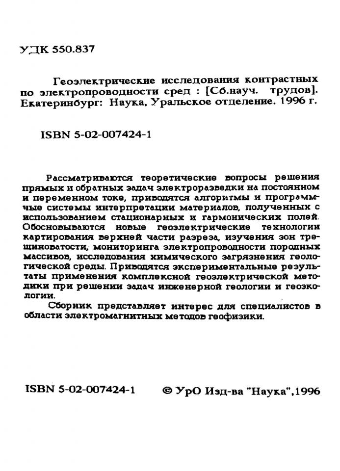 Вишнев В. С. О возможности использования поля токов тяговой сети железной дороги в инженерной геофизике / В. С. Вишнев // Геоэлектрические исследования контрастных по электропроводности сред : сборник научных трудов. - Екатеринбург : Наука, Уральское отделение, 1996. - С. 112-127.