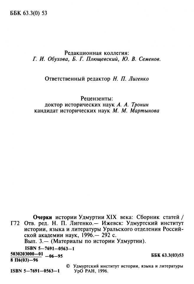 Очерки истории Удмуртии ХIX века : сборник статей / Российская академия наук, Уральское отделение, Удмуртский институт истории, языка и литературы ; ответственный редактор Н. П. Лигенко. - Ижевск, 1996. - 293 с. - (Материалы к истории Удмуртии. Основана в 1994 г. ; вып. 3).