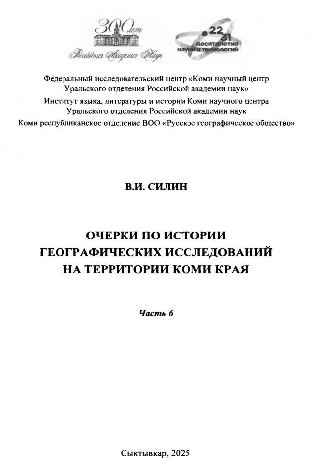 Издание может быть использовано в качестве учебного пособия по спецкурсу «История освоения и географического изучения территории Республики Коми». The proposed publication continue the author’s series of works devoted to the history of research and development of the territory of the Komi Republic and adjacent territories. They are intended primarily for specialists on the history of the Komi region, students of natural sciences at regional universities, as well as local historians, geography and history teachers, and schoolchildren. The publication can be successfully used as a textbook for the special course ‘History of development and geographical research of the territory of the Komi Republic.