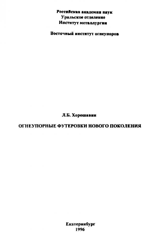 Хорошавин Л. Б. Огнеупорные футеровки нового поколения / Л. Б. Хорошавин ; ответственный редактор В. Л. Лисин ; Российская академия наук, Уральское отделение, Институт металлургии [и др.]. - Екатеринбург, 1996. - 20 с.