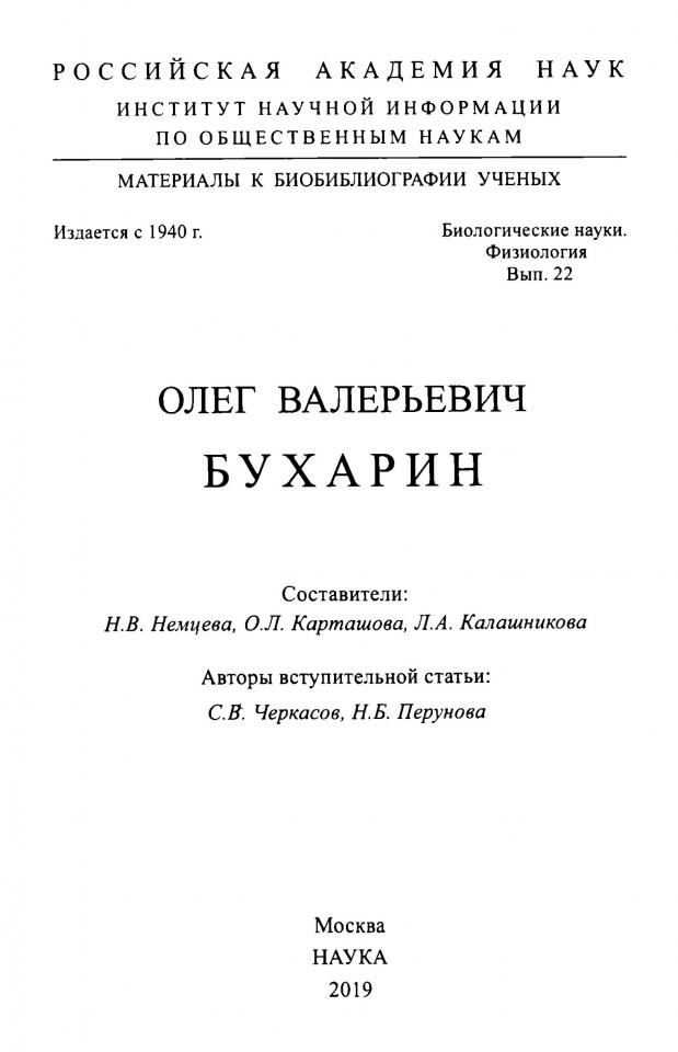 Олег Валерьевич Бухарин / Российская академия наук [и др.] ; авторы вступительной статьи: С. В. Черкасова, Н. Б. Перунова ; составители: Н. В. Немцева, О. Л. Карташова, Л. А. Калашникова. - Москва : Наука, 2019. - 161. - (Биобиблиография ученых) (Материалы к биобиблиографии ученых. Биологические науки. Физиология ; вып. 22).