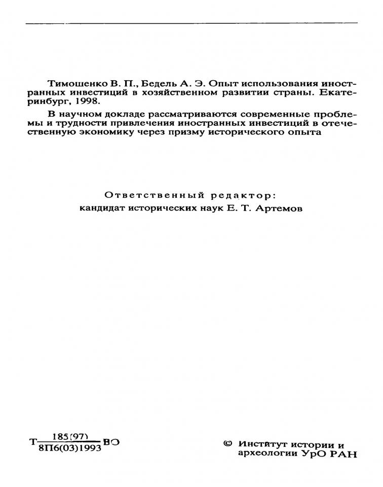 Тимошенко В. П. Опыт использования иностранных инвестиций в хозяйственном развитии страны / В. П. Тимошенко, А. Э. Бедель ; ответственный редактор Е. Т. Артемов ; Российская академия наук, Уральское отделение, Институт истории и археологии. - Екатеринбург, 1997. - 68 с.