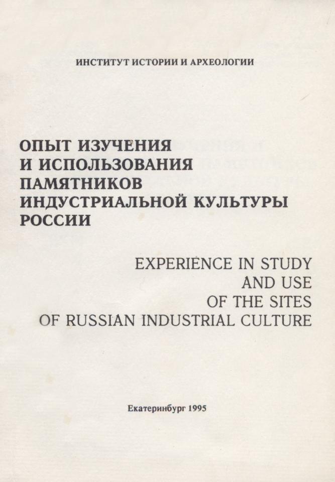 Опыт изучения и использования памятников индустриальной культуры России = Experence in Study and Use of the Sites of Russian Industrial Culture : сборник докладов IX Международного конгресса "От индустрии к индустриальному наследию" (Монреаль-Оттава, 29 мая - 2 июня 1994), XXII Международной научной конференции Общества Индустриальной археологии (Торонто, 2-5 июня 1994 г., III Международной конференции по горной истории (Денвер, 6-10 июня 1994 г.) / Российская академия наук, Уральское отделение, Институт истории и археологии. - Екатеринбург : Банк культурной информации, 1995. - 176 с.