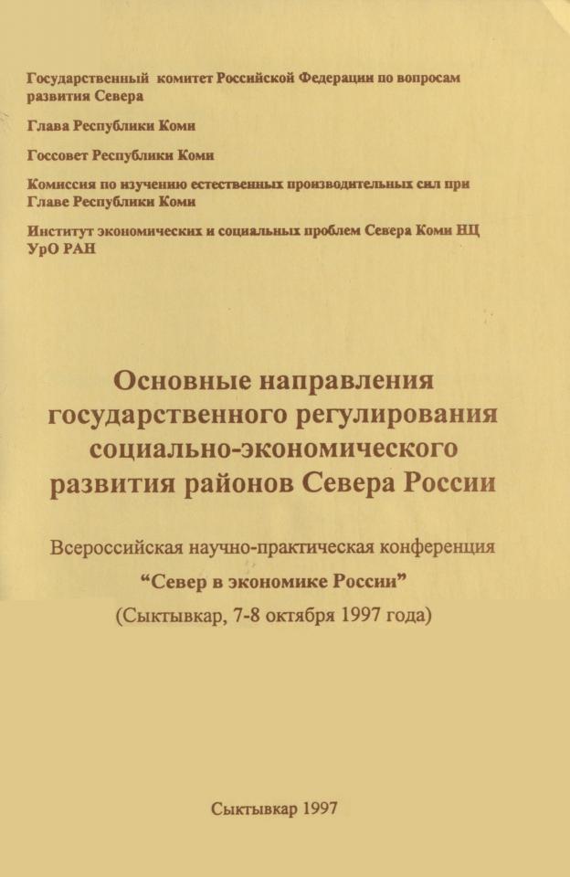 Основные направления государственного регулирования социально-экономического развития районов Севера России : Всероссийская научно-практическая конференция "Север в экономике России" (Сыктывкар, 7-8 октября 1997 года) / Институт экономических и социальны проблем Севера Коми НЦ УрО РАН [и др.]. - Сыктывкар, 1997. - 42 с.