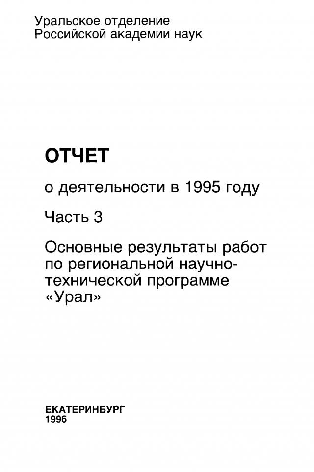 Отчет о деятельности в 1995 году / Уральское отделение Российской академии наук ; ответственный за выпуск В. К. Янц. - Екатеринбург, 1996. - Ч. 3 : Основные результаты работ по региональной научно-технической программе "Урал". - 161 с.