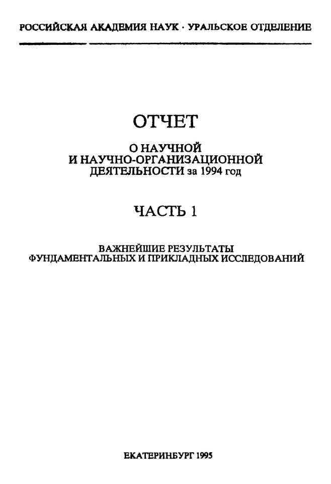 Отчет о научной и научно-организационной деятельности за 1994 год / Российская академия наук, Уральское отделение. - Екатеринбург, 1995. - Ч. 1 : Важнейшие результаты фундаментальных и прикладных исследований. - 97,[1] с.