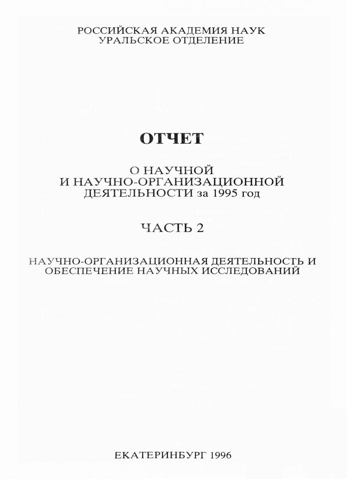 Отчет о научной и научно-организационной деятельности за 1995 год / Уральское отделение Российской академии наук ; ответственные за выпуск Е. П. Романов, Г. И. Якунина. - Екатеринбург, 1996. - Ч. 2 : Научно-организационная деятельность и обеспечение научных исследований. - 59 с.