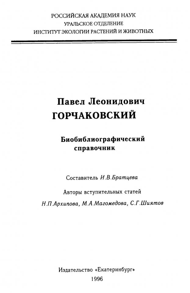 Павел Леонидович Горчаковский : биобиблиографический справочник / Российская академия наук, Уральское отделение, Институт экологии растений и животных ; вступительная статья Н. П. Архиповой [и др.] ; ответственный редактор С. Г. Шиятов ; составитель И. В. Братцева. - Екатеринбург, 1996. - 81 с.