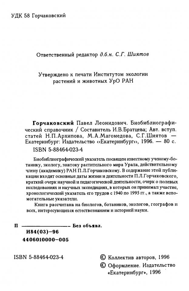Павел Леонидович Горчаковский : биобиблиографический справочник / Российская академия наук, Уральское отделение, Институт экологии растений и животных ; вступительная статья Н. П. Архиповой [и др.] ; ответственный редактор С. Г. Шиятов ; составитель И. В. Братцева. - Екатеринбург, 1996. - 81 с.