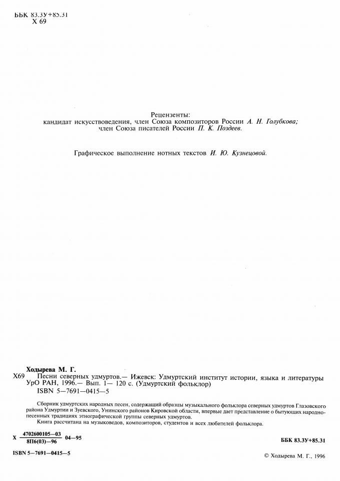 Ходырева М. Г. Песни северных удмуртов / М. Г. Ходырева ; Российская академия наук, Уральское отделение, Удмуртский институт истории, языка и литературы. - Ижевск, 1996. - Вып. I. - 1996. - 119 с. - (Удмуртский фольклор. Песни).