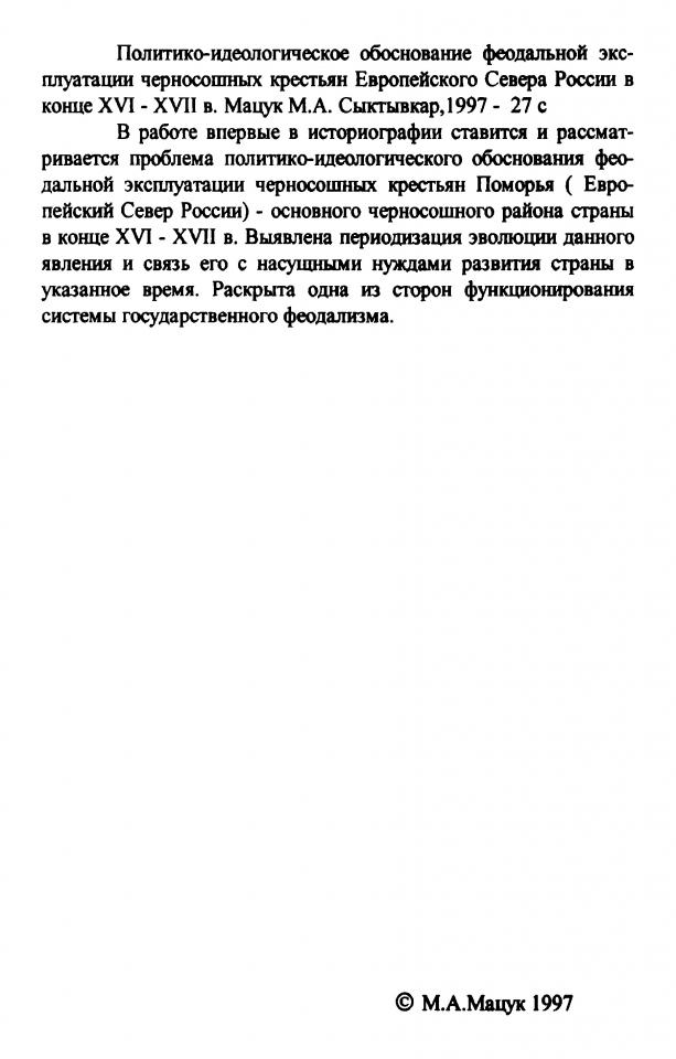 Мацук М. А. Политико-идеологическое обоснование феодальной эксплуатации черносошных крестьян Европейского Севера России в конце XVI-XVII в. / М. А. Мацук. - Сыктывкар, 1997. - 28 с.