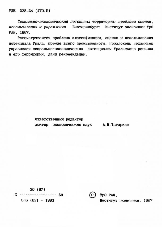 Татаркин Л. И. Потенциал Уральского региона: проблемы классификации и использования / Л. И. Татаркин // Социально-экономический потенциал территории: проблемы оценки, использования и управления : материалы региональной научно-практической конференции, Екатеринбург, 23-24 декабря 1996 г. - Екатеринбург, 1997. - С. 7-23.