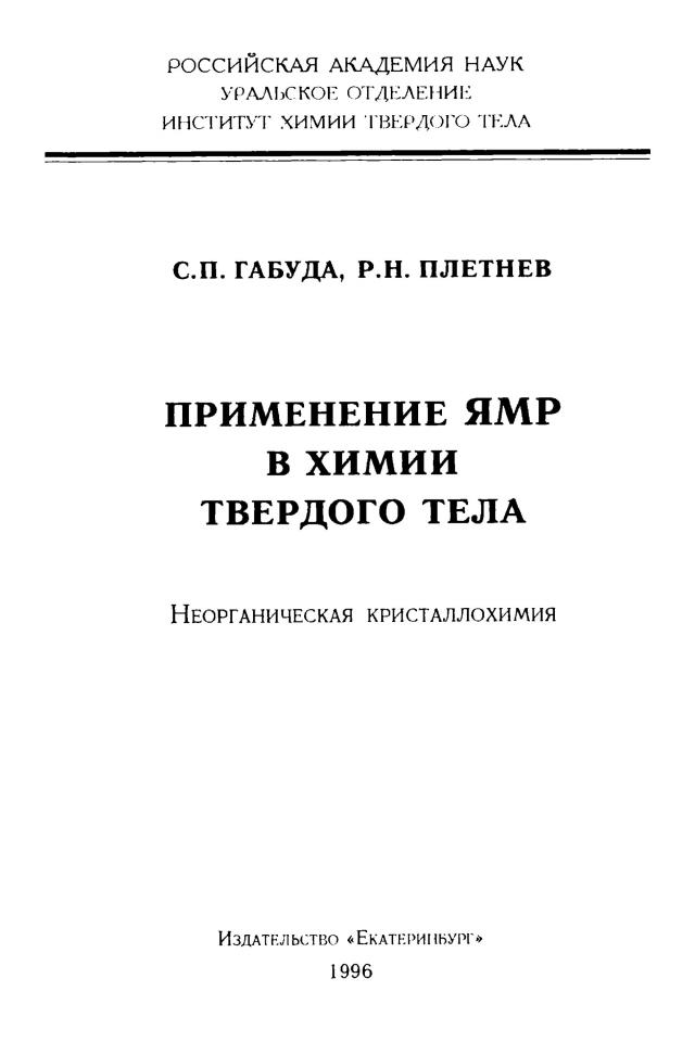 Габуда С. П. Применение ЯМР в химии твердого тела. Неорганическая кристаллохимия / С. П. Габуда, Р. Н. Плетнев ; ответственный редактор Г. П. Швейкин ; Российская академия наук, Уральское отделение, Институт химии твердого тела. - Екатеринбург : Екатеринбург, 1996. - 468 с. - (Труды ученых УрО РАН. Серия "Химия твердого тела").