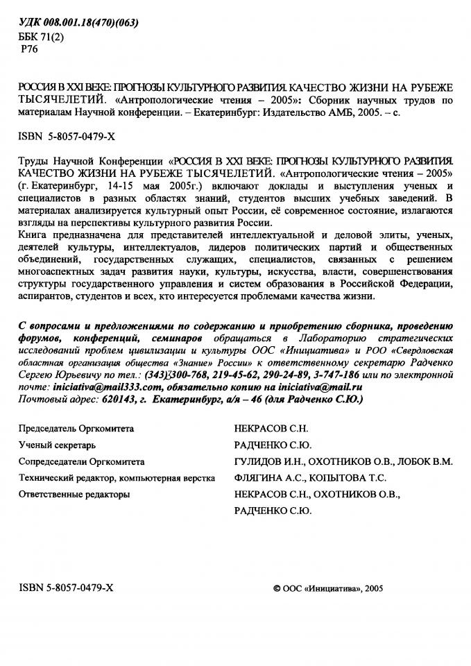 Попыванова М. С. Проблемы человека в свете современных исследований цивилизации / М. С. Попыванова // Россия в XXI веке: прогнозы культурного развития. Качество жизни на рубеже тысячелетий : сборник научных трудов по материалам научной конференции, Екатеринбург, 14 - 15 мая 2005 г. - Екатеринбург : АМБ, 2005. - С. 367-368.