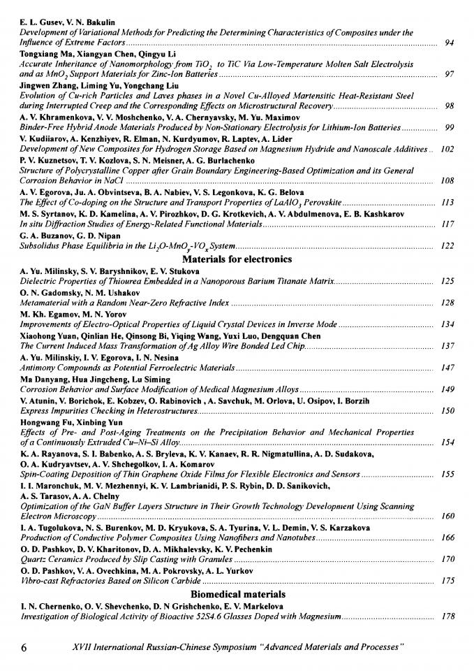 В Сборник вошли работы, представленные на XVII Международном Российско-Китайском Симпозиуме “Новые материалы и технологии” (Екатеринбург, 18-22 августа 2025 г.). Цель Симпозиума - укрепление двухсторонних научных и научно-технических связей для создания и разработки новых материалов и технологий, повышение уровня информационного обмена между российскими и китайскими учеными, популяризация достижений в области материаловедения и междисциплинарных исследований. Тематика Симпозиума включает следующие разделы современного материаловедения: Материалы авиационной и космической техники; Материалы для энергетики; материалы для электроники; Биомедицинские материалы; Редкие и драгоценные металлы, высокочистые вещества; Материалы для энергосбережения. Зеленые технологии, катализаторы; Поверхностные явления и технология покрытий; Лазерно-информационные технологии создания изделий сложной конфигурации; Функциональные материалы, в том числе тугоплавкие, особо твёрдые материалы, магнитные материалы; Новые технологии в металлургическом процессе; Моделирование и цифровизация в металлургическом процессе. Все статьи настоящего выпуска прошли рецензирование и были рекомендованы для публикации. Издание может представлять интерес для специалистов, аспирантов и студентов старших курсов соответствующих специальностей. The present publication includes papers presented and considered at the XVII International Russian-Chinese Symposium '‘Advanced Materials and Processes” (Yekaterinburg, August 18-22, 2025). The aim of the Symposium consists in strengthening bilateral scientific and scientific-technical ties between researchers of the countries in the field of designing and development of new materials and technologies, increasing the level of information exchange between Russian and Chinese scientists, and popularization of achievements in various fields of materials science and interdisciplinary investigations. The subjects of the Symposium cover the following sections of the modem materials science in field of metallic, ceramic, and composite materials: Materials for aviation and space technology; Materials for energy; Materials for electronics; Biomedical materials; Rare and precious metals, high-purity substances; Materials for energy saving. Green technologies, catalysts; Surface phenomena and coating technologies; Laser-inlbrmation technologies for manufacturing complex-shape products; Functional materials, including refractory, superhard materials, magnetic materials; New technologies in metallurgical process; Simulating and digitizing in metallurgical process. All papers of the present issue were peer reviewed and recommended for publication. The publication may be of interest for specialists in the materials science, postgraduate students, and students of advanced courses.
