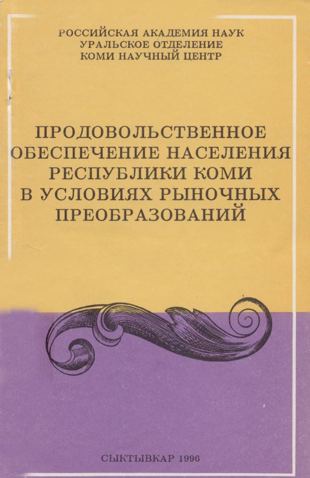 Иванов В. А. Продовольственное обеспечение населения Республики Коми в условиях рыночных преобразований / В. А. Иванов, Л. А. Кузиванова, В. В. Терентьев ; Российская академия наук, Уральское отделение, Коми научный центр, Институт экономических и социальных проблем Севера. - Сыктывкар, 1996. - 92 с.