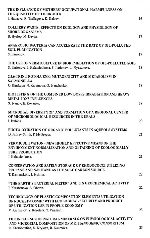 Production of ecologically harmless biosurfactant complexes synthesised by Rhodococcus ruber / M. Kuyukina, I. Ivshina, J. Philp, N. Christofi // The 1995 International Co-Conference on Environmental Polution (ICEP’ 95) and Neuroimmuno Interactions and Environment (ICONE’ 95), 17-24 July, 1995, Saint Petersburg, Russia. - Saint Petersburg, Russia, 1995. - P. 32.