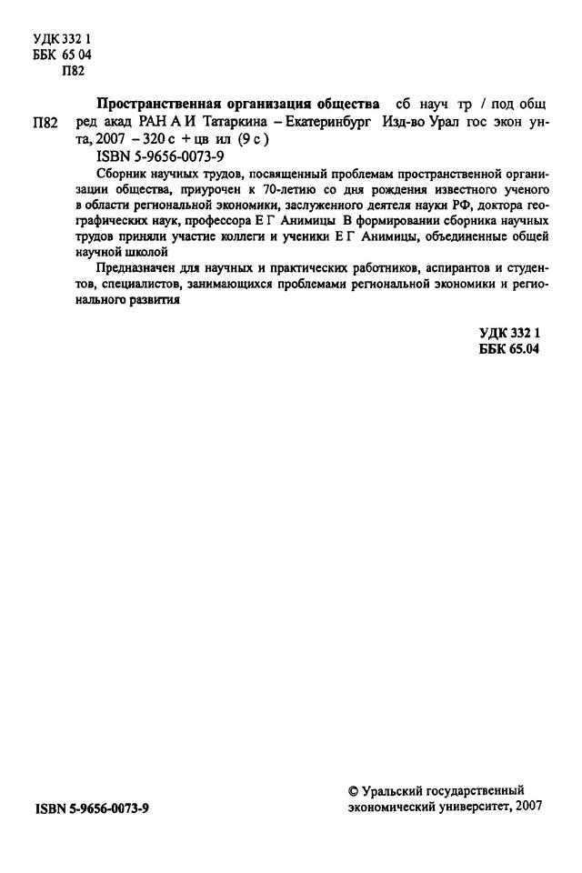 Пространственная организация общества : сборник научных трудов / Уральский государственный экономический университет [и др.] ; под общей редакцией А. И. Татаркина. - Екатеринбург, 2007. - 318, [2] с.