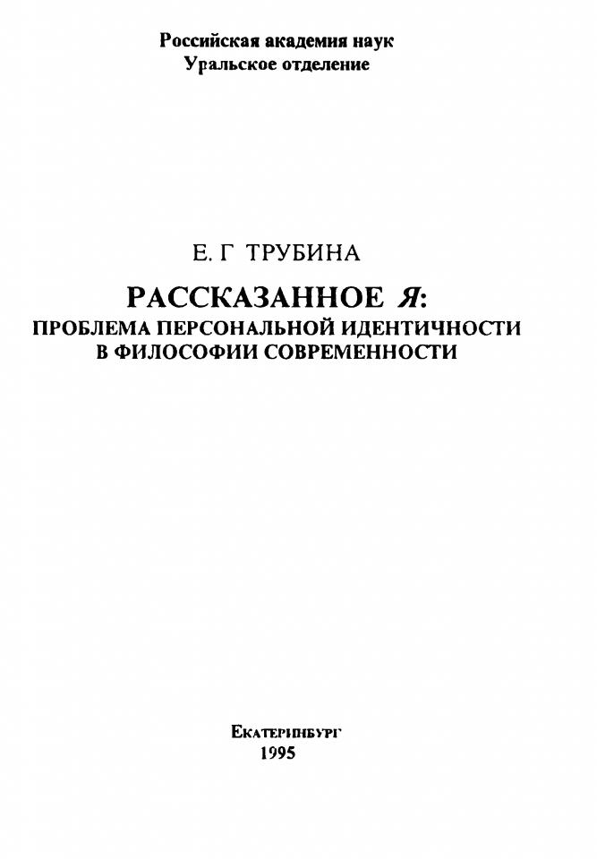 Трубина Е. Г. Рассказанное Я: проблема персональной идентичности в философии современности / Е. Г. Трубина ; ответственный редактор И. Я. Лойфман ; Российская академия наук, Уральское отделение. - Екатеринбург, 1995. - 152 с.