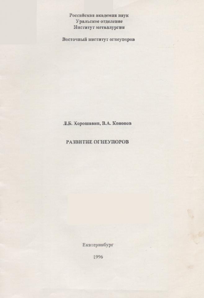 Хорошавин Л. Б. Развитие огнеупоров / Л. Б. Хорошавин, В. А. Кононов ; ответственный редактор Л. Б. Хорошавин ; ответственный за выпуск Е. Н. Козырева ; Российская академия наук, Уральское отделение, Институт металлургии [и др.]. - Екатеринбург, 1996. - 21 с.